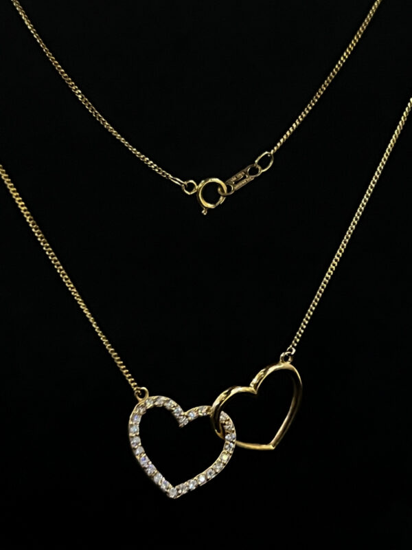 Este collar cuenta con una cadena delgada y elegante, también de oro de 14 quilates, que se ajusta a la perfección al cuello y permite que los corazones entrelazados sean el centro de atención. La cadena tiene un cierre seguro y fácil de usar, garantizando la comodidad y la tranquilidad de quien lo porta.